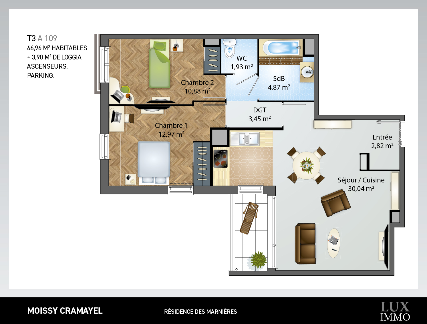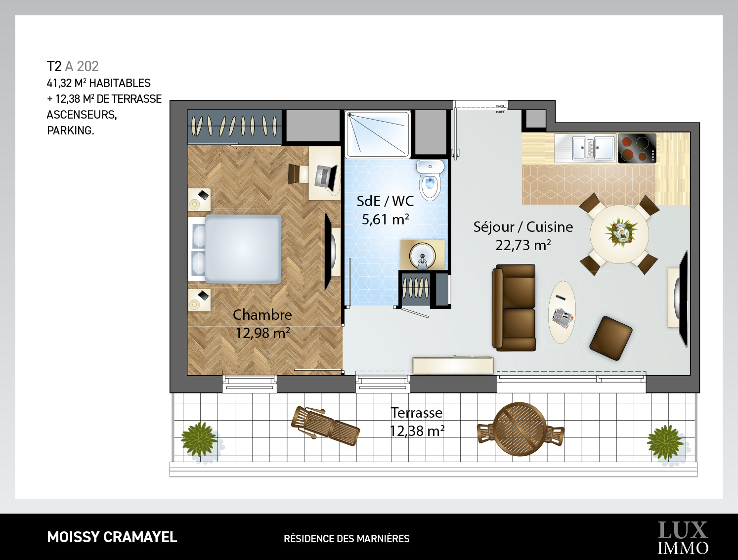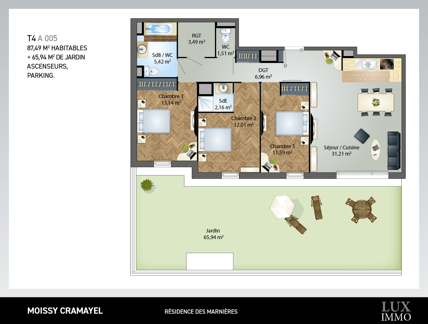 Découvrez un bâtiment à l'esthétique contemporaine conçu comme un véritable havre de paix urbain mais qui ne renonce pas à la convivialité d'un quartier vivant. Cette réalisation de haut standing se distingue par ses matériaux de qualité, offrant un cadre de vie apaisant. Situé au cœur d'un environnement recherché de Moissy-Cramayel, cet immeuble de haut standing vous propose des appartements du studio au 4 pièces (avec balcons, terrasses ou jardins privatifs).
